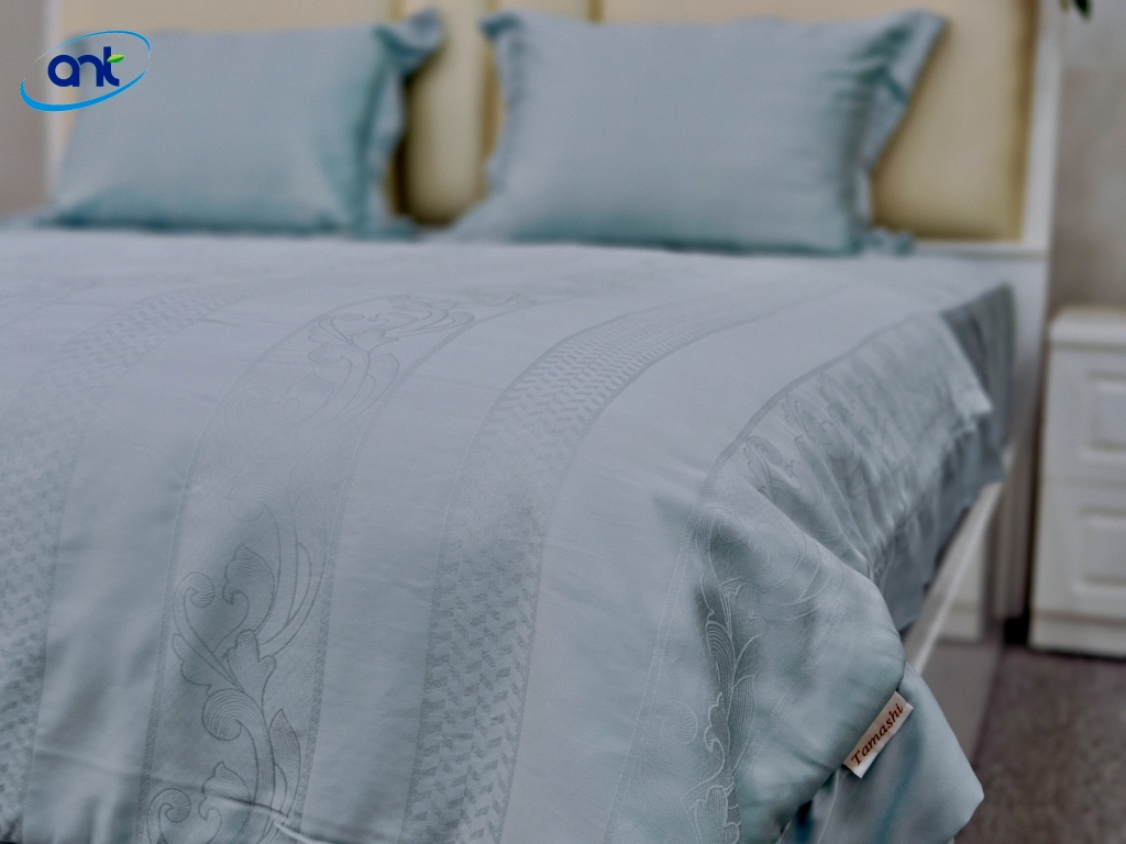 Tencel tơ lụa dệt Jacquard là chất liệu cao cấp kết hợp giữa sự mềm mịn của tơ lụa, độ thoáng mát của sợi Tencel và vẻ sang trọng của công nghệ dệt Jacquard hiện đại. Đây là loại vải được ưa chuộng trong các dòng chăn ga gối cao cấp nhờ cảm giác chạm mượt mà, độ bền vượt trội và họa tiết tinh xảo.