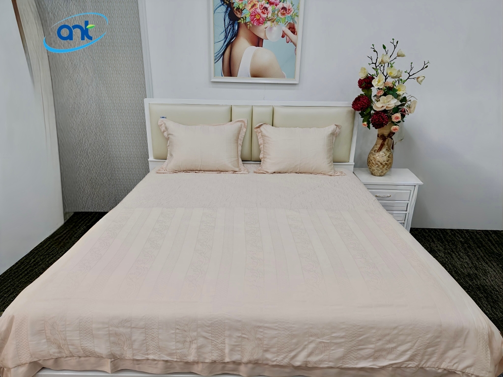 Tencel tơ lụa dệt Jacquard là chất liệu cao cấp kết hợp giữa sự mềm mịn của tơ lụa, độ thoáng mát của sợi Tencel và vẻ sang trọng của công nghệ dệt Jacquard hiện đại. Đây là loại vải được ưa chuộng trong các dòng chăn ga gối cao cấp nhờ cảm giác chạm mượt mà, độ bền vượt trội và họa tiết tinh xảo.